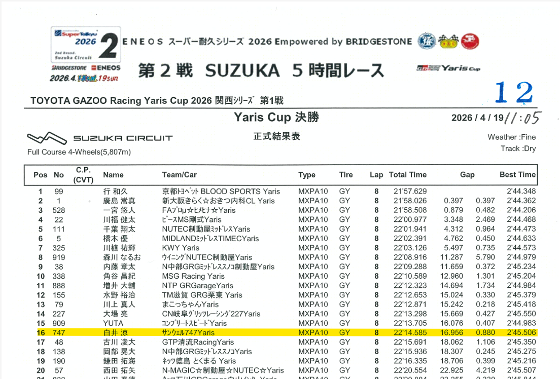 このたび、TOYOTA GAZOO Racing Yaris Cup 2026 関西シリーズ 第1戦 にて開催されたレースへ『サンウェル747Yaris』号が参加いたしましたので、ご報告いたします。